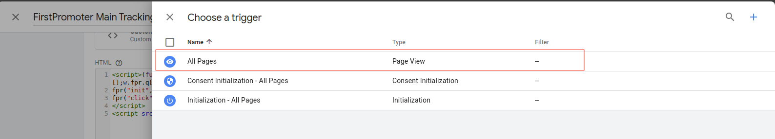 triggeringsection, click on it and choose when to trigger the tag.We recommend selecting thepages triggerto load theMain tracking scripton all your landing pages.