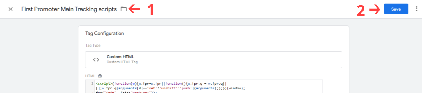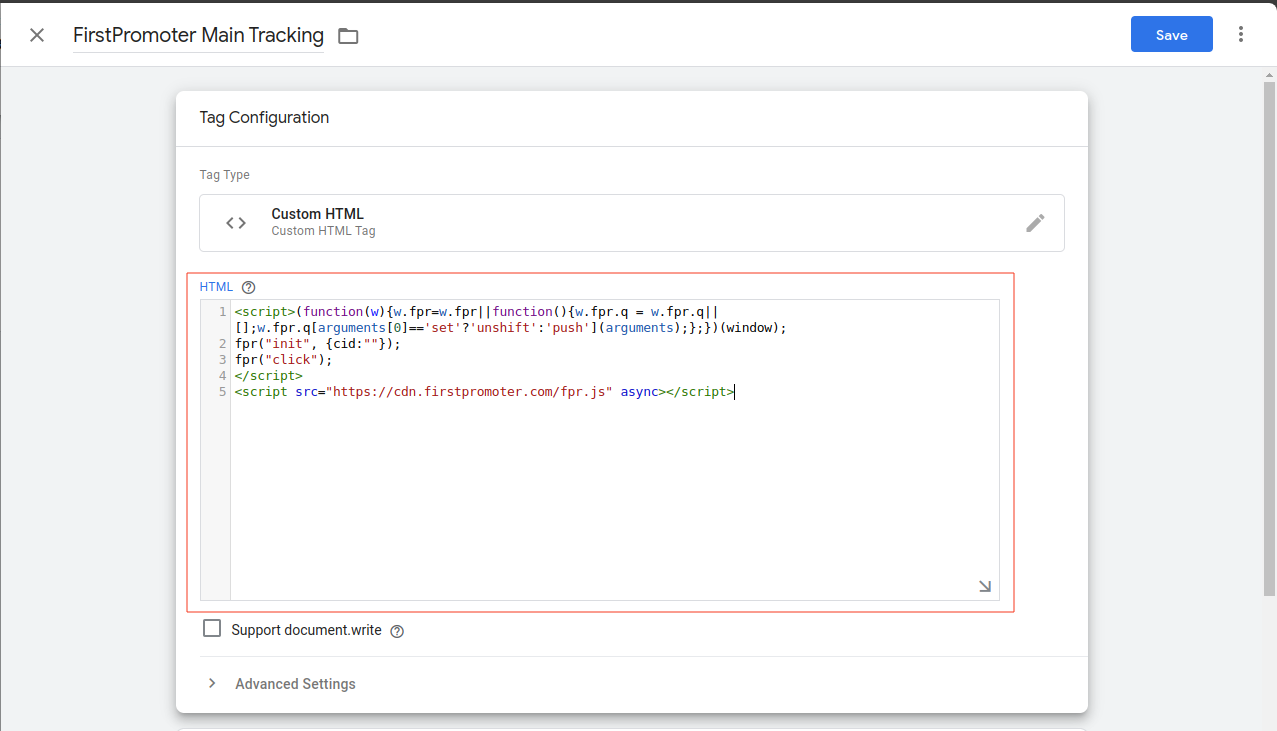 Main tracking scriptcopied from FirstPromoter into theHTMLSection. As shown in the screenshot below: